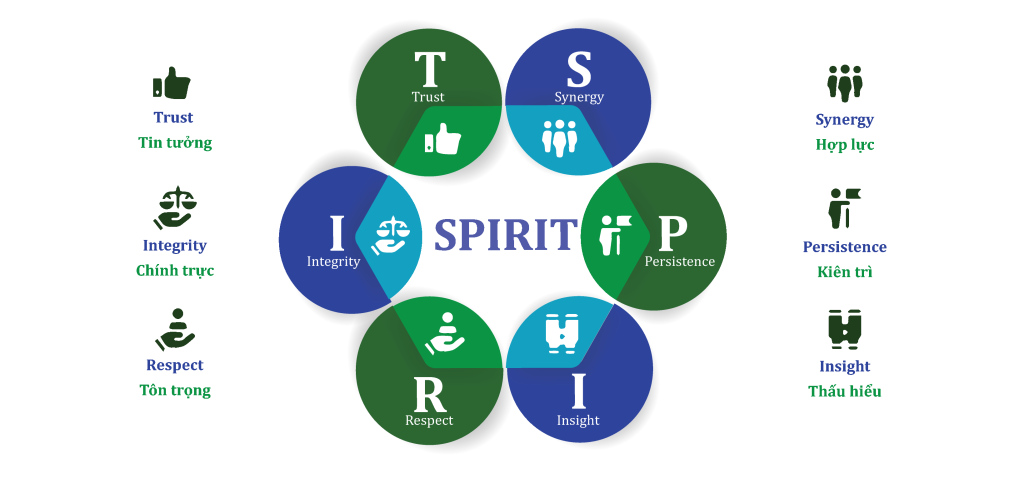 Để hiện thực hóa sứ mệnh đó, toàn bộ đội ngũ VPower luôn đề cao và phát huy bảy giá trị cốt lõi được thể hiện trong hệ thống “SPIRIT”: